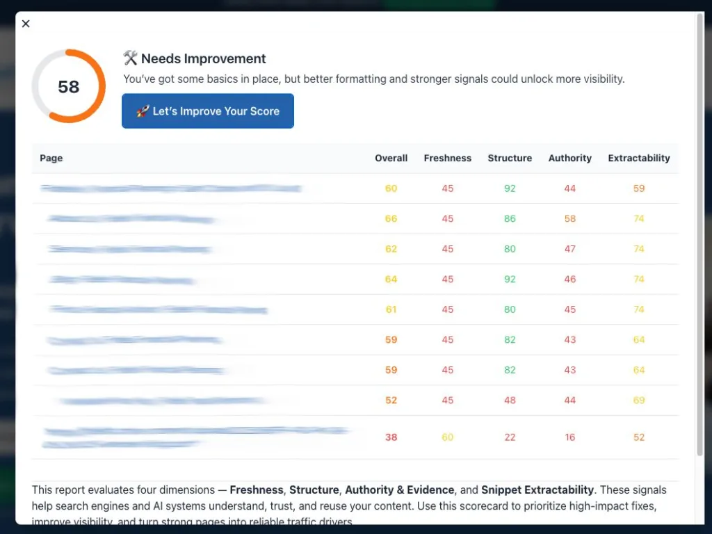 Most pages scored between 52 and 66 overall. Structure often scored high, between 80 and 92. Freshness, authority, and extractability lagged far behind, typically landing in the mid-40s to low-60s range.